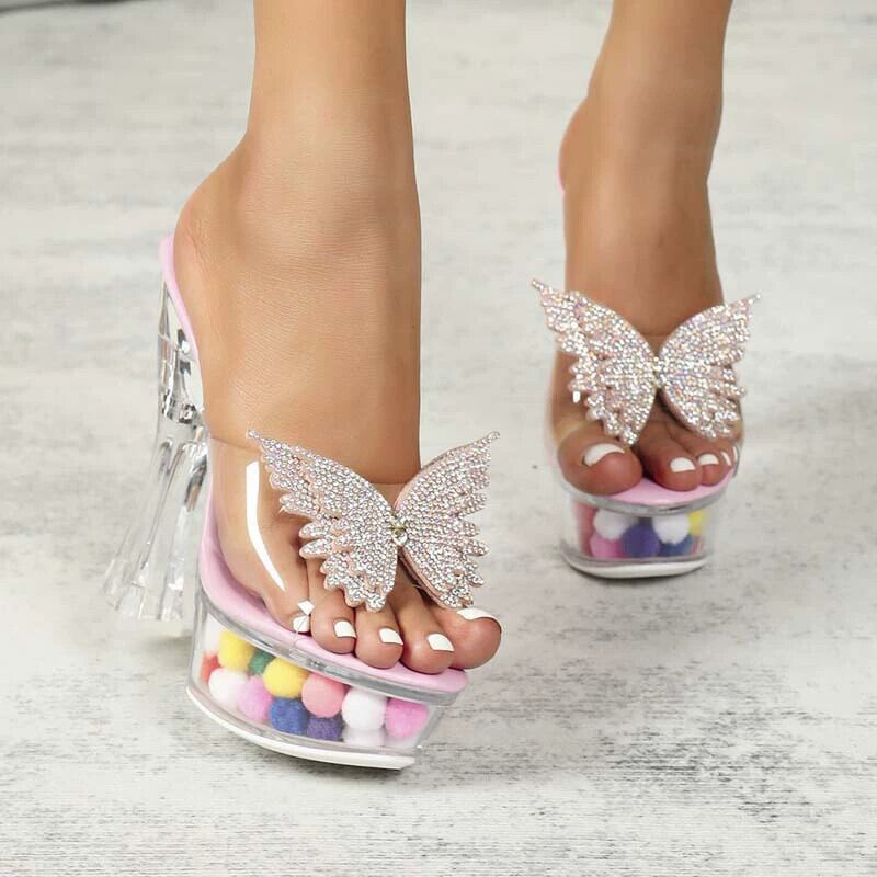 透明 14 センチメートル厚いヒール新しい蝶オープントゥ嫌な厚底サンダルとスリッパプラスサイズのナイトクラブモデルキャットウォークファッション 帽子 ミュール 靴 シューズ 大きめサイズ shoe15675931034
