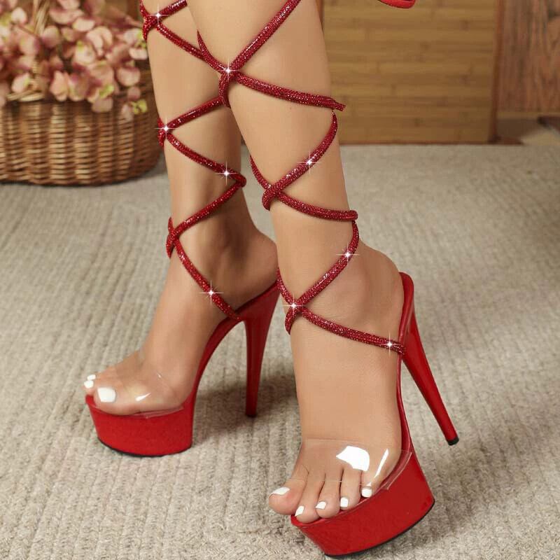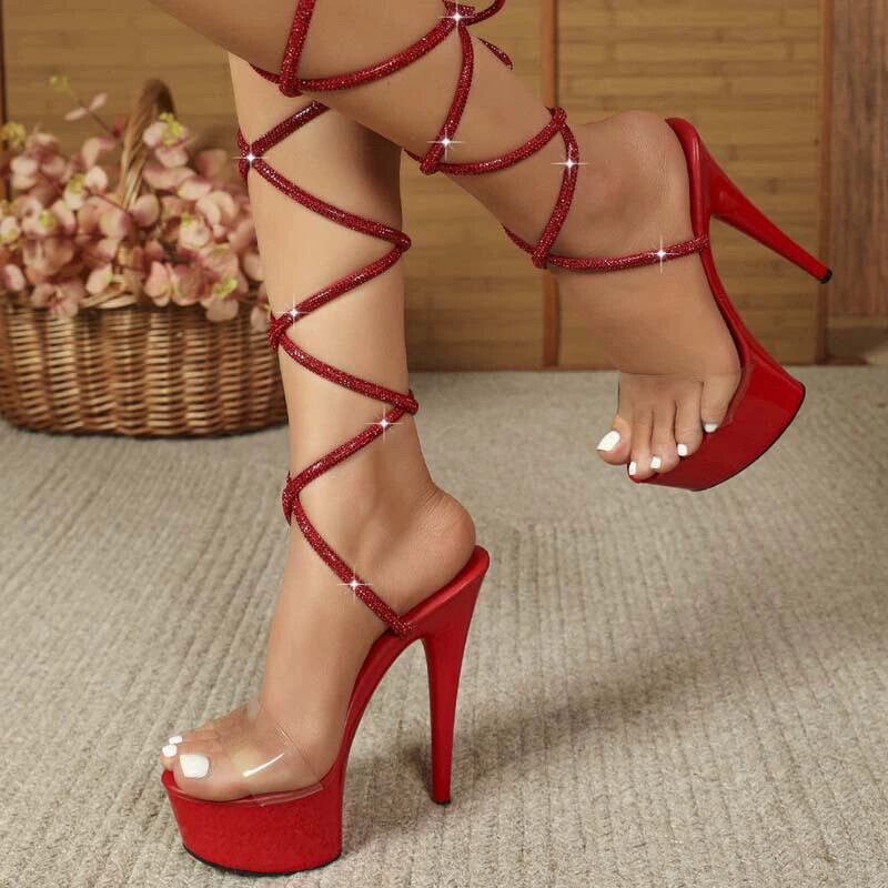 ナイトクラブステージ 15 センチメートルセクシーなローマオープントゥストラップスティレットヒールスカイハイサンダルモデルキャットウォーク大型防水プラットホーム 靴 シューズ 大きめサイズ shoe90469260095